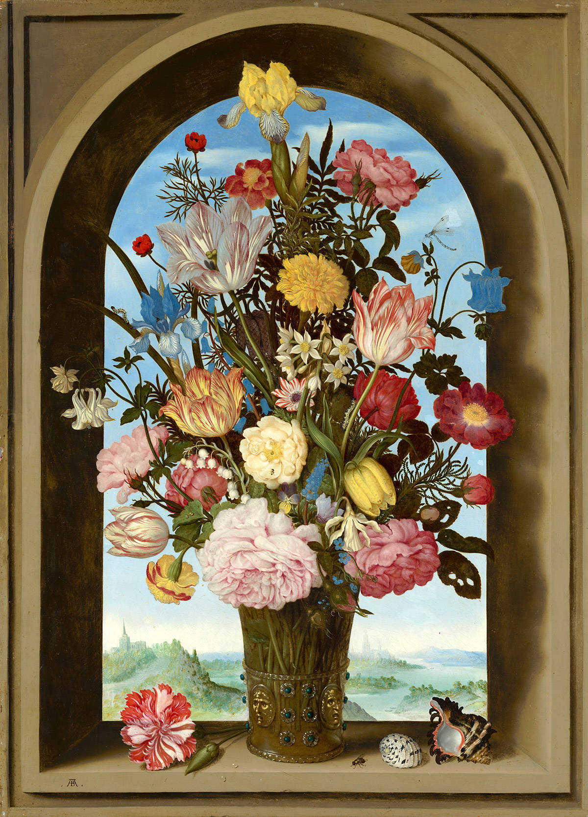 Vaas met bloemen in een venster is één van de topstukken uit de collectie van het Mauritshuis. Bosschaert schilderde dit bontgekleurde boeket van wel dertig verschillende soorten bloemen. Ter voorbereiding bestudeerde hij gedurende een jaar de bloemen los van elkaar. Zo kon hij een boeket samenstellen van bloemen die in werkelijkheid niet tegelijkertijd bloeien. Daarmee biedt dit schilderij een overzicht van de mooiste bloemen die Bosschaert kende, waaronder de tulp die toen in Holland nog zeldzaam was.
