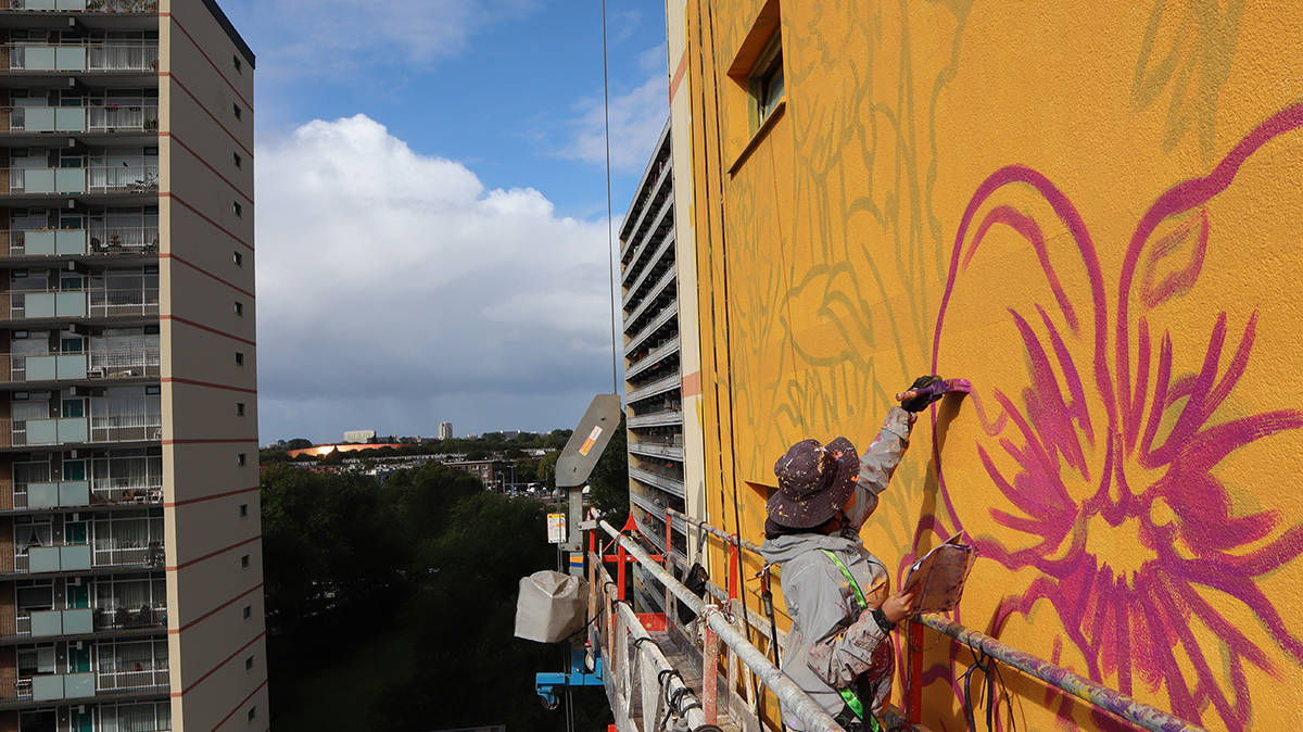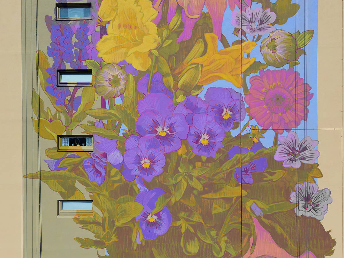 In deze muurschildering heeft GLEO ook haar favoriete bloemen uit Nederland geschilderd: paarse viooltjes.