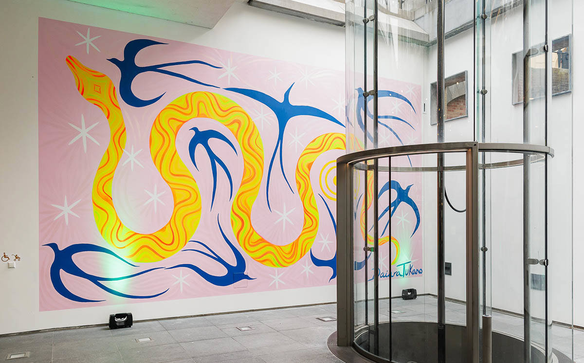 Daiara Tukano: "In dit werk staat een heel klein, maar belangrijk vogeltje centraal, namelijk de zwaluw. Zwaluwen zijn vogels die over de hele wereld reizen. En net als de reizigers die naar onze gebieden kwamen, gaan ook zij heen en weer tussen de Amazone en Europa. Op deze muurschildering zien we ook de kano-slang, een beeld dat aan de basis ligt van ons oorsprongsverhaal (wij zijn de volkeren van de kano-slang der verandering). De kano-slang wordt vergezeld door een zwerm vrije vogels die meezingen met de wind met een boodschap van nieuwe contacten, nieuwe dialogen die ontstaan op deze plek van herinnering, tussen Brazilië en Nederland, tussen de Amazone en Den Haag en dit museum."
