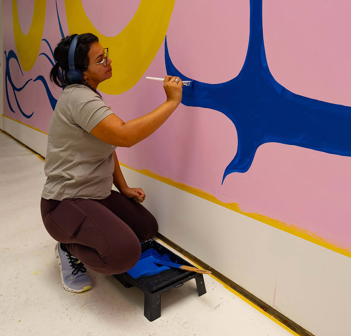 Daiara Tukano maakte verschillende schetsen voor deze muurschildering, waaruit de medewerkers van het museum konden kiezen. Dit is niet de manier waarop ze gewoonlijk werkt. “Het proces is heel persoonlijk en elke keer anders. Er is niet één manier om te werken.” Normaal gesproken plant ze niet van tevoren, zegt ze, en maakt ze schetsen uit de vrije hand direct op de muur.