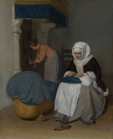 Handwerkende vrouw bij een wieg
