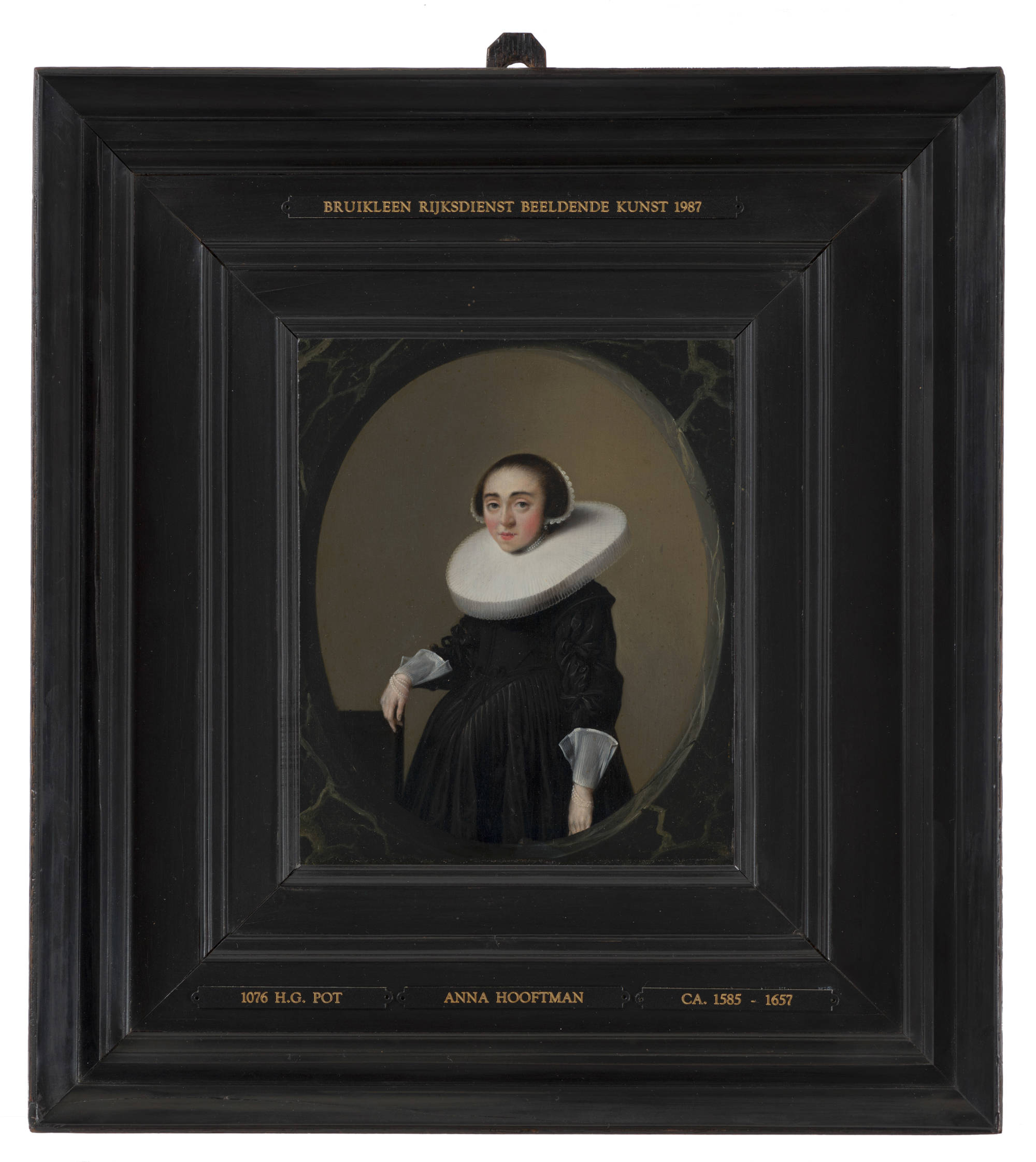 Deze twee paneeltjes horen bij elkaar. Links staat de Amsterdamse koopman Jean Fontaine, 25 jaar oud, rechts zijn vrouw Anna Hooftman, 20 jaar oud. Ze lieten zich ter gelegenheid van hun huwelijk portretteren door Hendrick Pot. Hij schilderde ze in een ovale omlijsting van imitatiemarmer. De beide portretjes zitten nog in hun originele lijst.