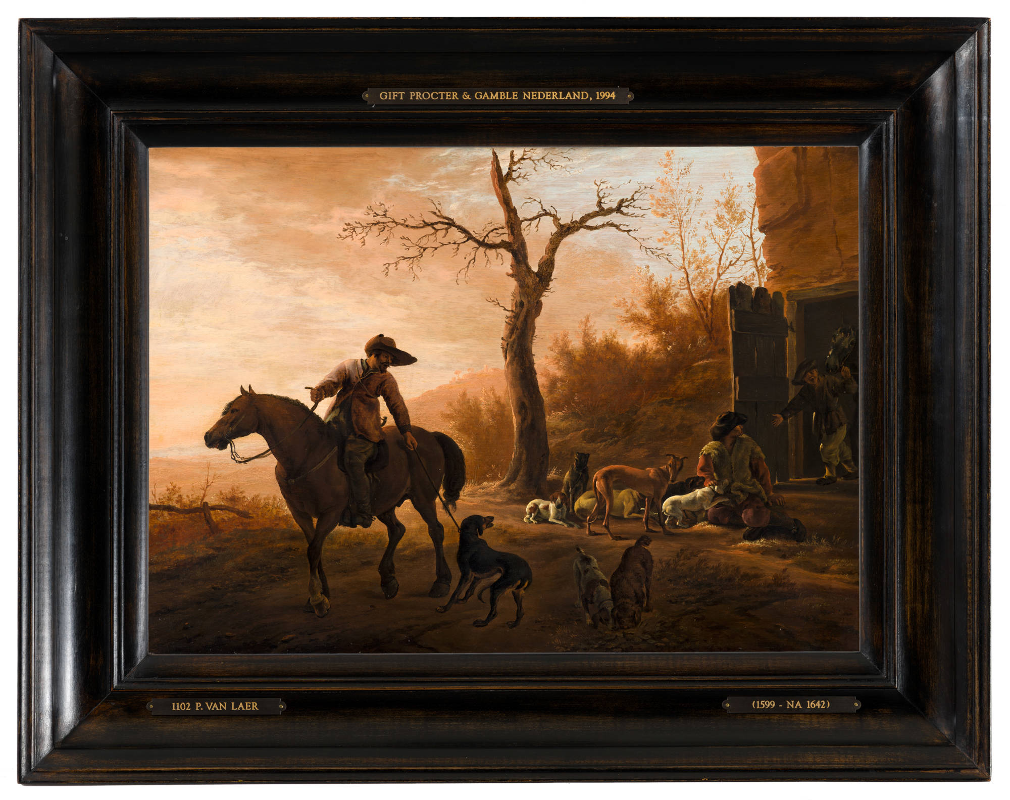 Bij een stal bereiden wat jagers zich voor op de jacht. Ze worden overspoeld door een warm, gouden licht dat zuidelijk aandoet. Het silhouet van de ruiter steekt er krachtig tegen af.