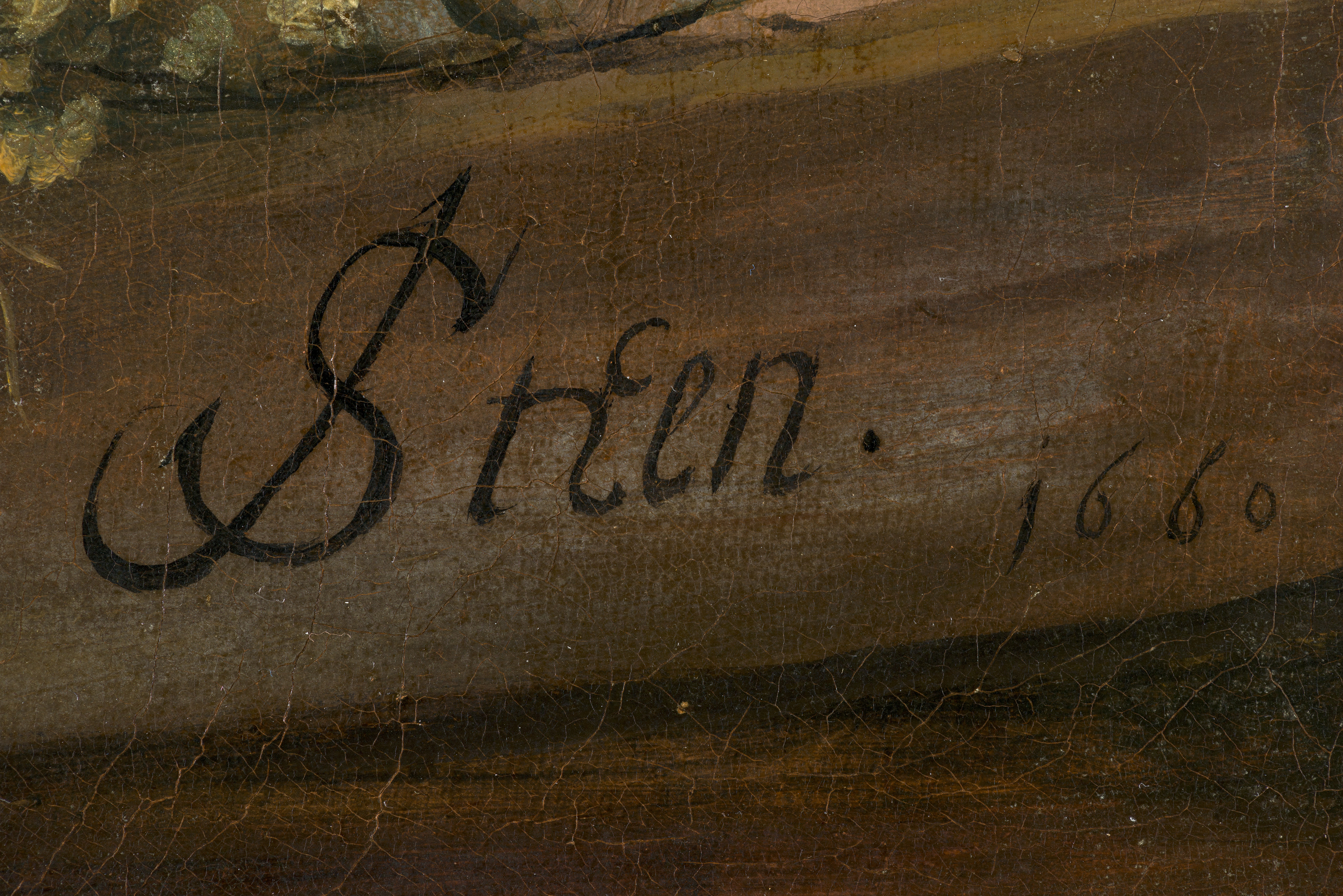 Er zijn weinig portretten van Steen bekend, maar als hij er één schilderde, dan maakte hij er iets heel bijzonders van. In 1655, vijf jaar vóór De hoenderhof, had hij al eens een portret van een meisje geschilderd. Ook zij is op een topografisch herkenbare locatie weergegeven: op de stoep voor haar huis aan de Oude Delft in Delft. Rechtsachter is de torenspits van de Oude Kerk te zien. Midden in beeld zit – tamelijk breeduit – de vader van het meisje. Vanaf de straat wordt hij aangesproken door een armoedige oude vrouw die een klein kind bij zich heeft. Zij lijkt op een bedelares, maar misschien vraagt zij om een andere vorm van liefdadigheid; de brief in de hand van de heer kan daarmee te maken hebben. De identiteit van de deftige burger en zijn dochter is pas recent ontdekt. Hij was geen burgemeester, zoals altijd werd gedacht, maar een rijke Delftse graanhandelaar: de 43-jarige weduwnaar Adolf Croeser. Zijn enige kind Catharina was in 1655 dertien jaar oud; zij kijkt ons aan terwijl zij haar rokken ophoudt om van het stoepje te stappen. De Croesers woonden in een huis aan de westzijde van de Oude Delft. Aan de overkant van de gracht stond ‘De Roskam’, de brouwerij van Jan Steen toen hij tussen 1654 en 1657 in Delft woonde. Vader en dochter waren dus zijn overburen. Opvallend detail in de voorstelling is het mooie boeketje bloemen in de vensterbank naast de voordeur.