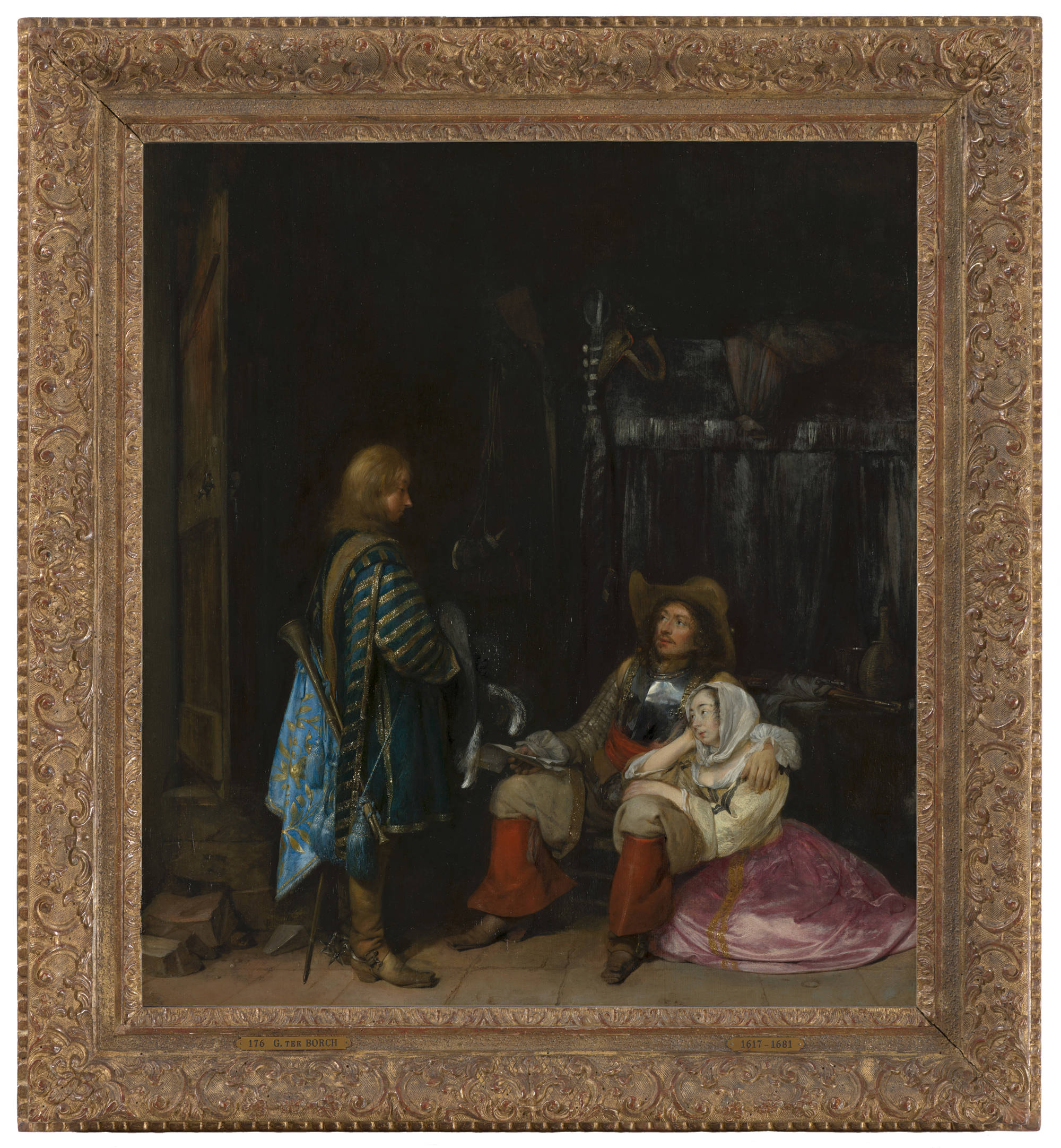 Mogelijk identiek met een schilderij in de veiling van Petronella de la Court, weduwe van Adam Oortmans, Amsterdam, 19 oktober 1707 (Lugt 2017), nr. 31 (‘Een Trompetter by een krygsoverste, van Gerard ter Burg’; 92 gulden); Govert van Slingelandt, Den Haag, in of voor 1752-1767; zijn weduwe, Agatha Huydecoper, Den Haag, 1767-1768; veiling Van Slingelandt, Den Haag, 18 mei 1768 (Lugt 1683), nr. 31; de gehele verzameling verkocht aan prins Willem V; prins Willem V, Den Haag, 1768-1795; in beslag genomen door de Fransen, overgebracht naar het Muséum central des arts/Musée Napoléon (Musée du Louvre), Parijs, 1795-1815; Koninklijk Kabinet van Schilderijen, gehuisvest in de Galerij Prins Willem V, Den Haag, 1816; overgebracht naar het Mauritshuis, 1822