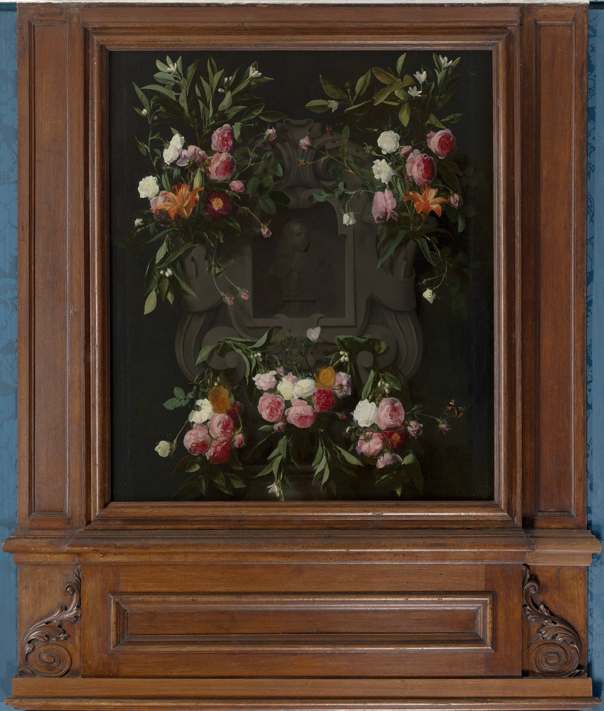 Seghers, een Vlaams specialist in het schilderen van bloemen, combineerde zijn bloemen vaak met een stenen beeldje. Hier is koning-stadhouder Willem III te zien, de stadhouder van Holland die ook koning van Engeland was. De takjes oranjebloesem en de oranje lelies verwijzen naar zijn familienaam: van Oranje. Het portretje is overigens pas na de dood van Seghers toegevoegd, door een onbekende schilder.