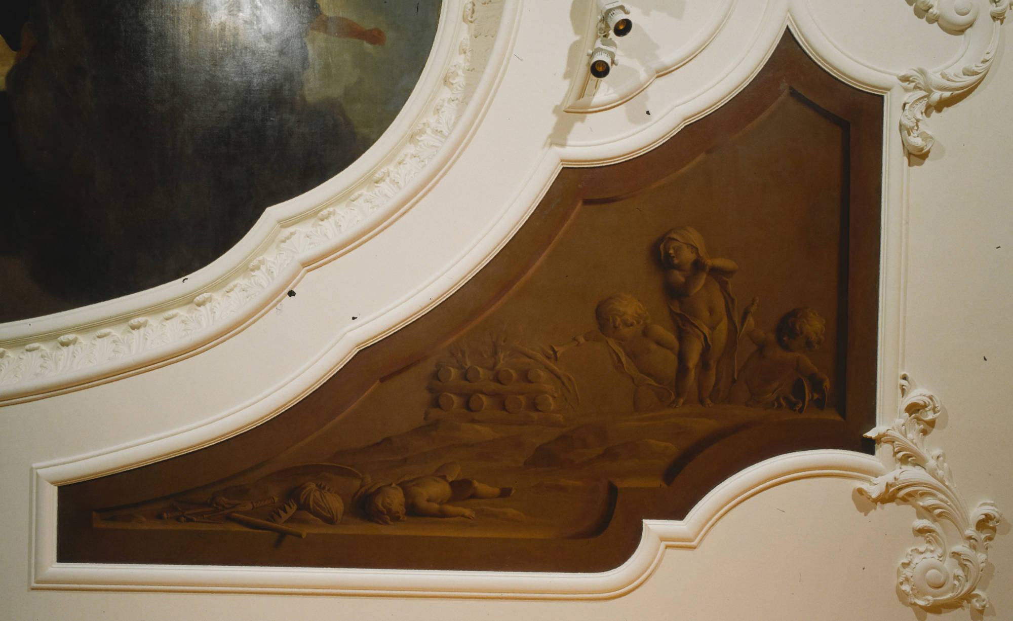 Geschilderd voor Rapenburg 48 in Leiden, de woning van Diederik van Leyden van Vlaardingen (samen met inv. nrs. 731-734); aankoop, 1910; geïnstalleerd in het plafond van de Potter Zaal, 1912