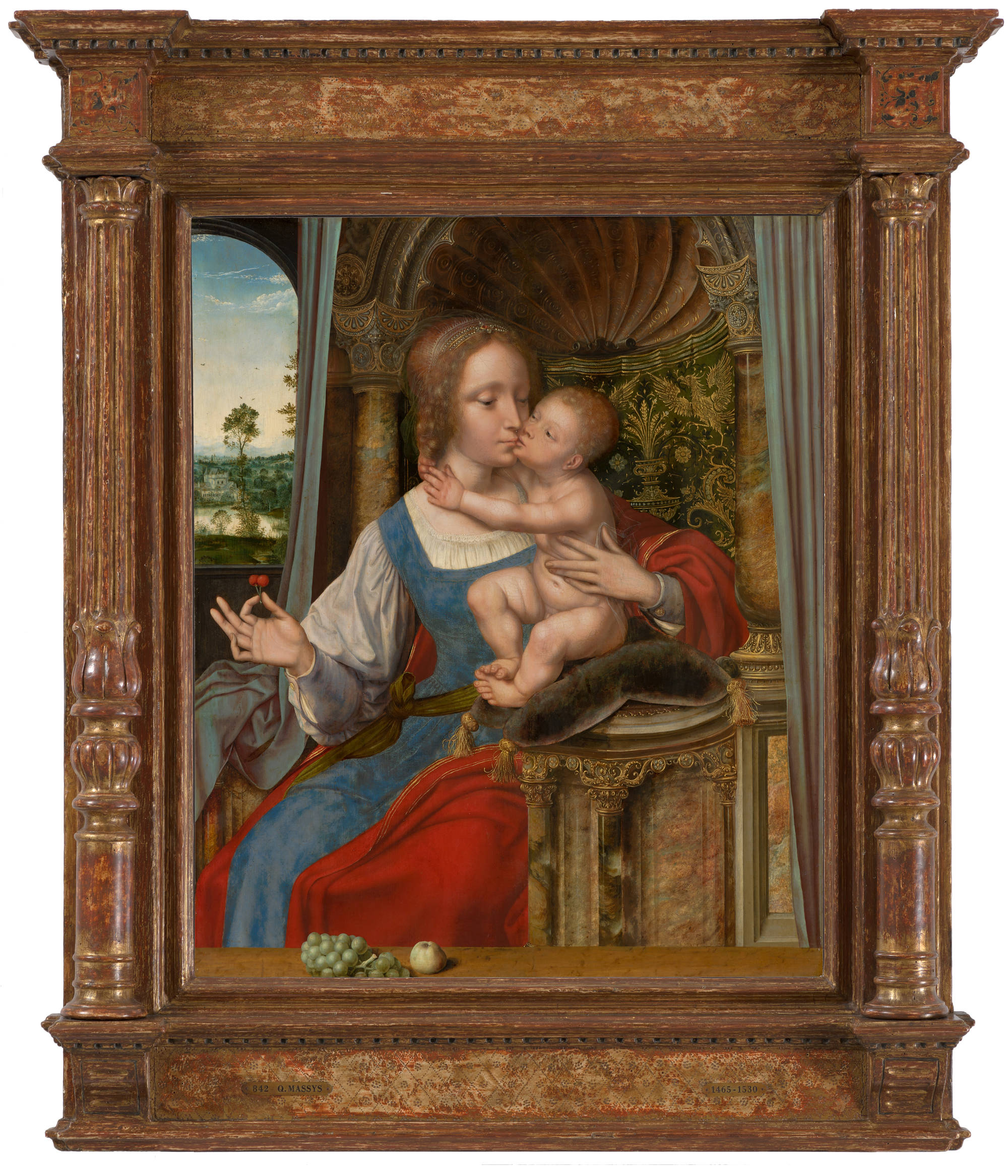 Quinten Massys plaatste zijn Madonna op een rijk versierde renaissance-troon met marmeren zuiltjes. De compositie was geliefd – hij schilderde er meerdere versies van.