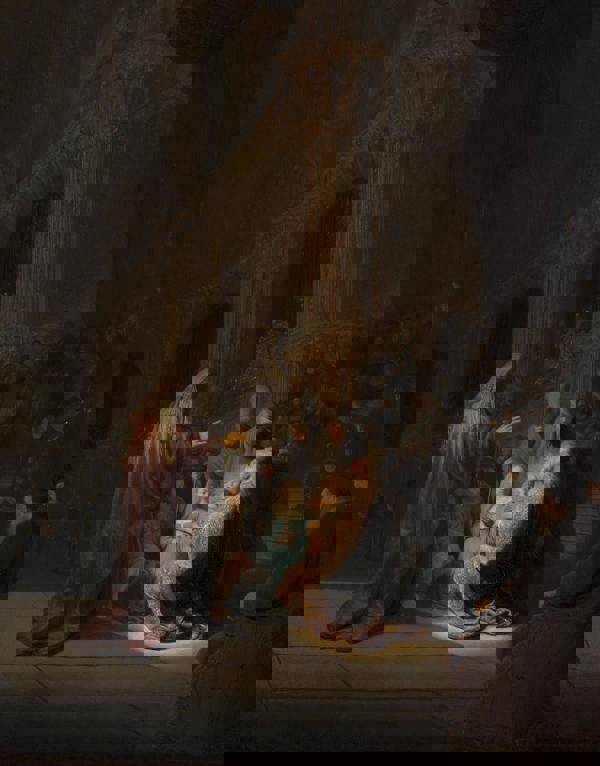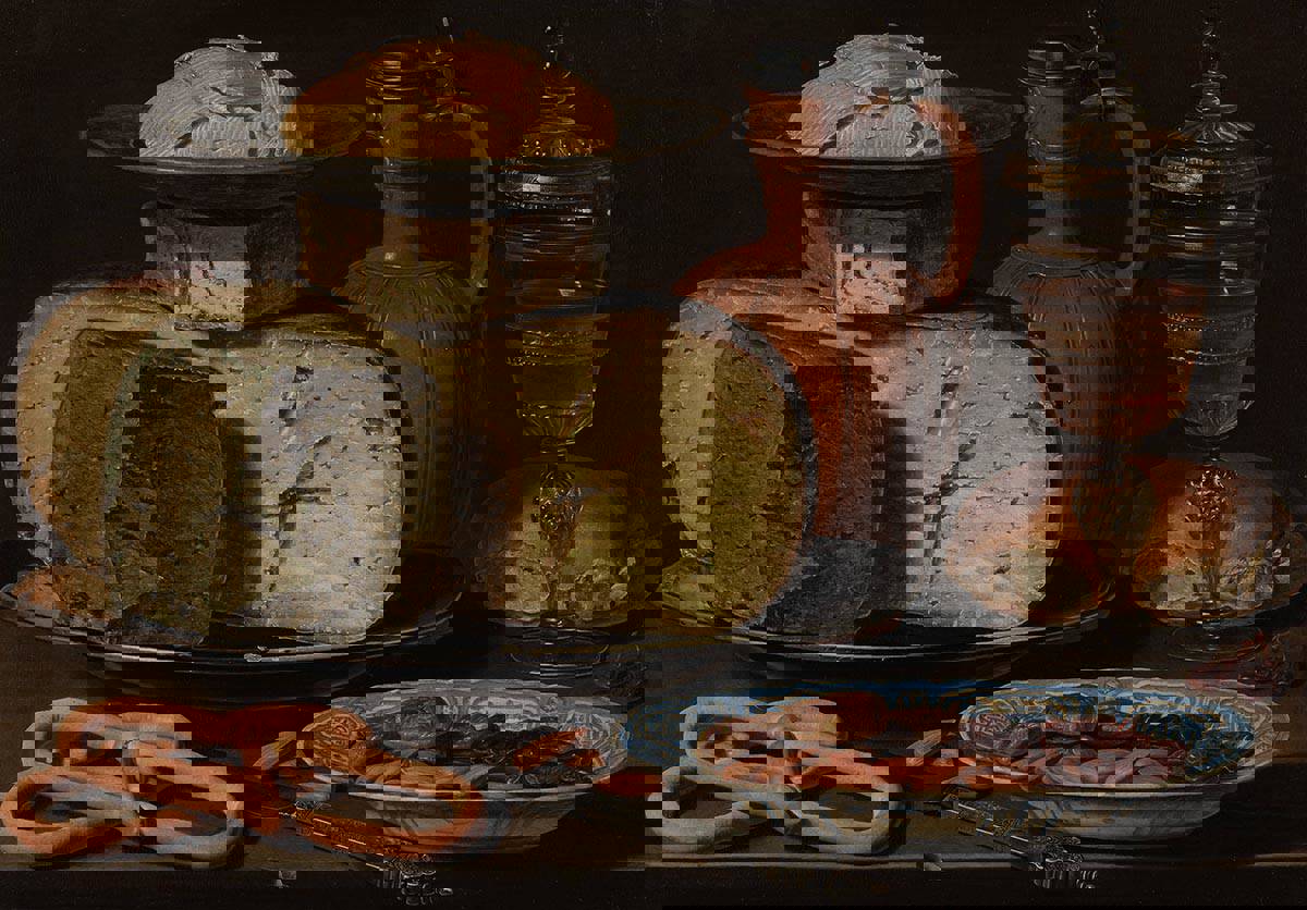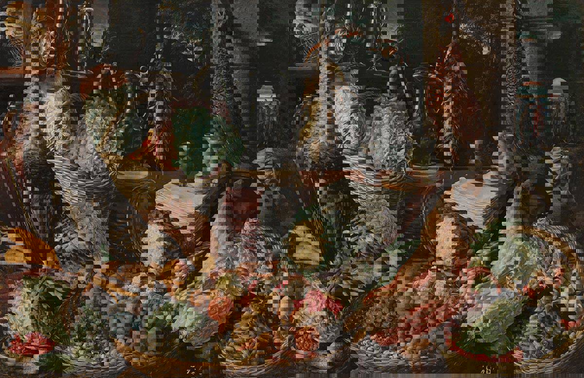 Dit is het schilderij Keukenscène met Christus en de Emmaüsgangers van Joachim Beuckelaer. Je oog valt meteen op de volle tafel met eten. Op de achtergrond, rechts in de hoek, zie je als je goed kijkt Christus en de Emmaüsgangers, een verhaal uit de Bijbel. Het is opvallend dat de nadruk lijkt te liggen op het eten dat bereid gaat worden, terwijl je aandacht eigenlijk naar de Bijbelse scène hoort te gaan. De schilder is helemaal losgegaan met de details. Dit schilderij wordt gezien als een voorloper van de 17de-eeuwse stillevens, waarin het Bijbelse verhaal is weggelaten.