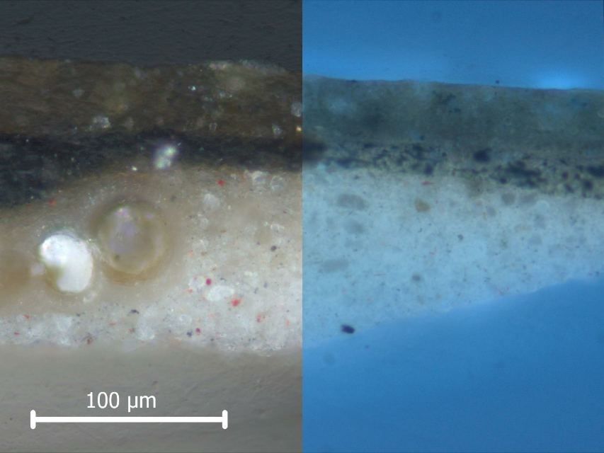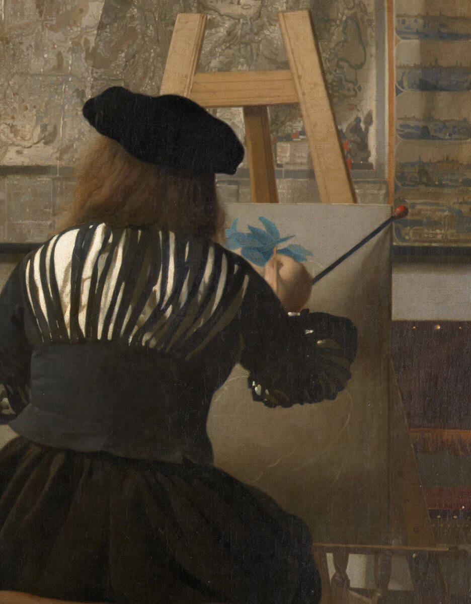 De grondlaag van het Meisje is licht beige-grijs van kleur, ongeveer 200 micrometer dik (0,2 mm) en helemaal tot de uiterste randen van het oorspronkelijke doek aangebracht. Stelt u zich nog eens voor hoe Vermeer voor zijn schildersezel gezeten moet hebben, starend naar het lege doek dat was voorzien van een lichte, grijs-beige grondering. Misschien leek hij op de schilder in dit detail van De schilderkunst (1666-1668). Hoe begon hij zijn compositie? We ontdekken het morgen.