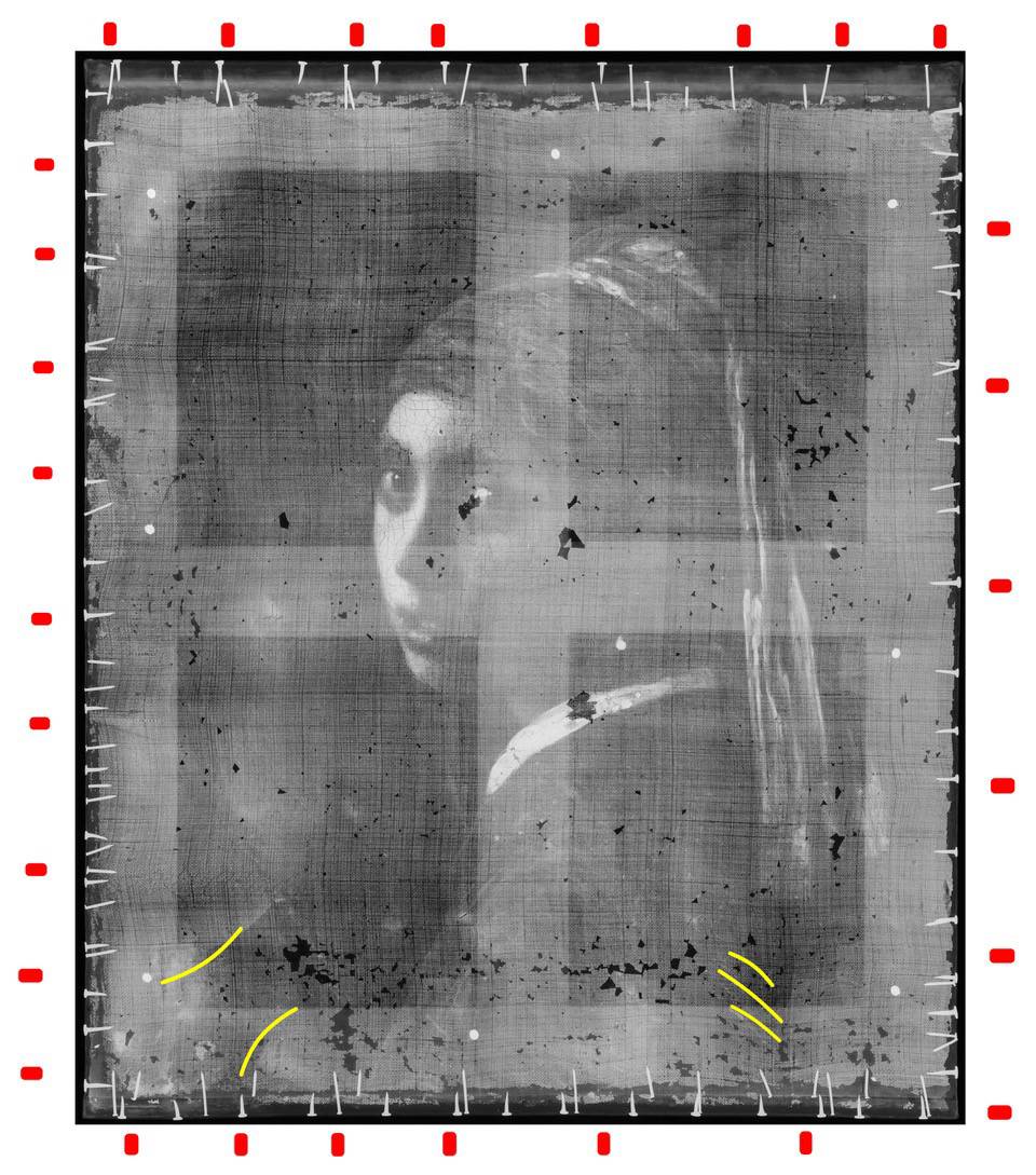 Op de röntgenfoto van het Meisje met de parel zien we dat dit schilderij op dezelfde manier is geprepareerd. Het doek was tijdens het aanbrengen van de grondering waarschijnlijk in een houten raam geregen (eenzelfde soort als in afb. 8c). De vervormingen (spanguirlandes) langs de randen van de foto komen overeen met de plekken waar de touwtjes aan het doek waren bevestigd (de stippen op afb. 8d). Als de witter het doek opspande, trok het touw aan deze punten en ontstonden er vervormingen langs de randen van het doek. De röntgenopname van het Meisje laat boogvormige streken zien waar de grondering dik met het grondeermes is aangebracht, vooral in de linker benedenhoek.