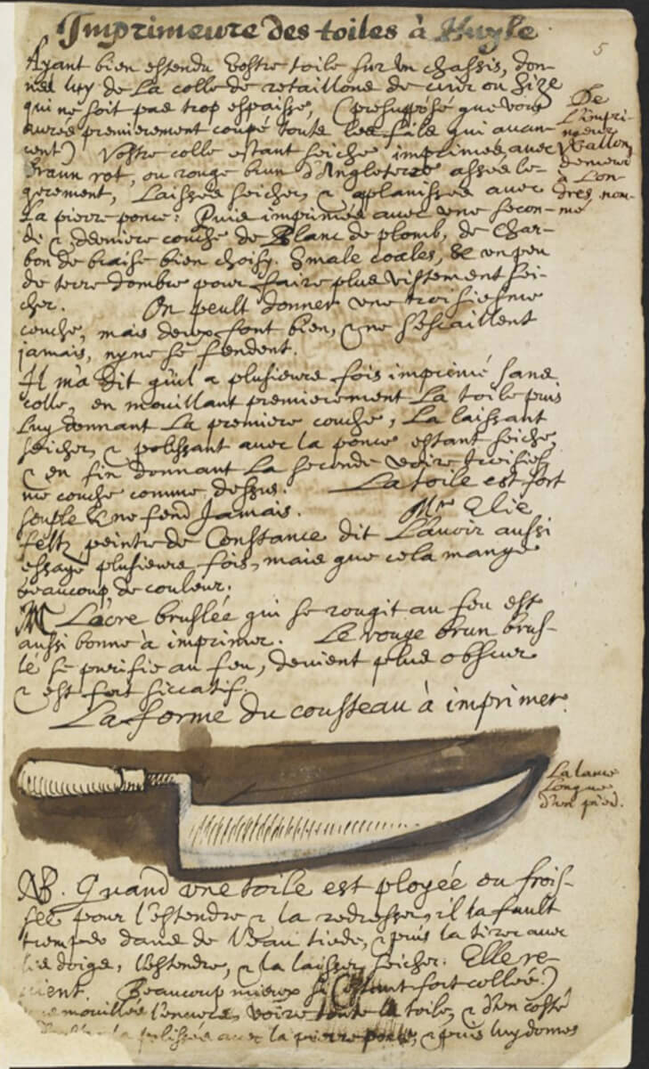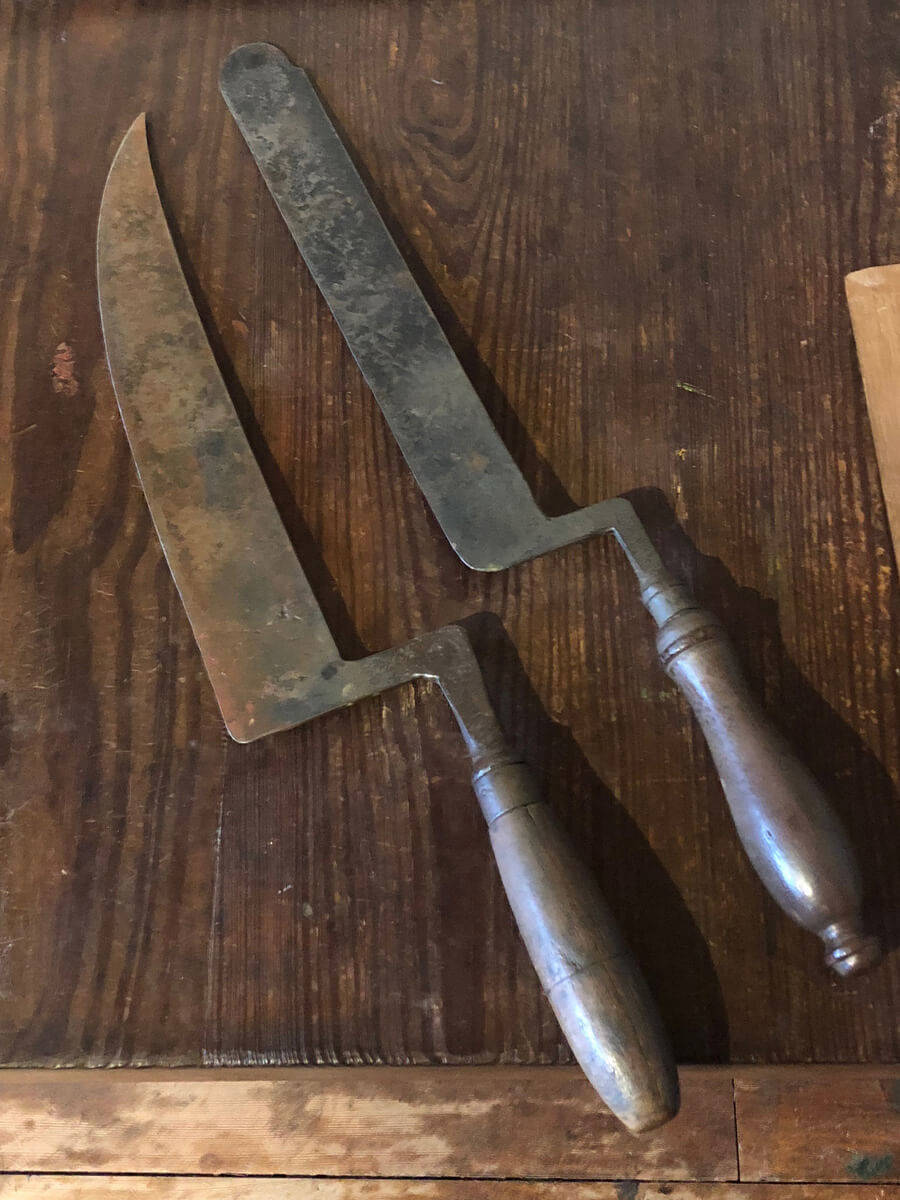 De arts Théodore de Mayerne stelde in de eerste helft van de zeventiende eeuw een manuscript samen (tegenwoordig in de collectie van de British Library) dat onze belangrijkste bron is voor hoe witters doeken grondeerden. Ze spanden het doek op een rijgraam, streken oneffenheden glad, haalden losse draden weg en bedekten het doek met een laag dierlijke lijm. Vervolgens werd met een gekromd grondeermes de grondering op het doek aangebracht – een lichte laag van pigmenten in olie (meestal in een beige, witte of grijzige kleur). De Mayerne maakte zelfs een tekening van het mes, dat erg lijkt op deze historische exemplaren die ik in het Rembrandthuis tegenkwam.
