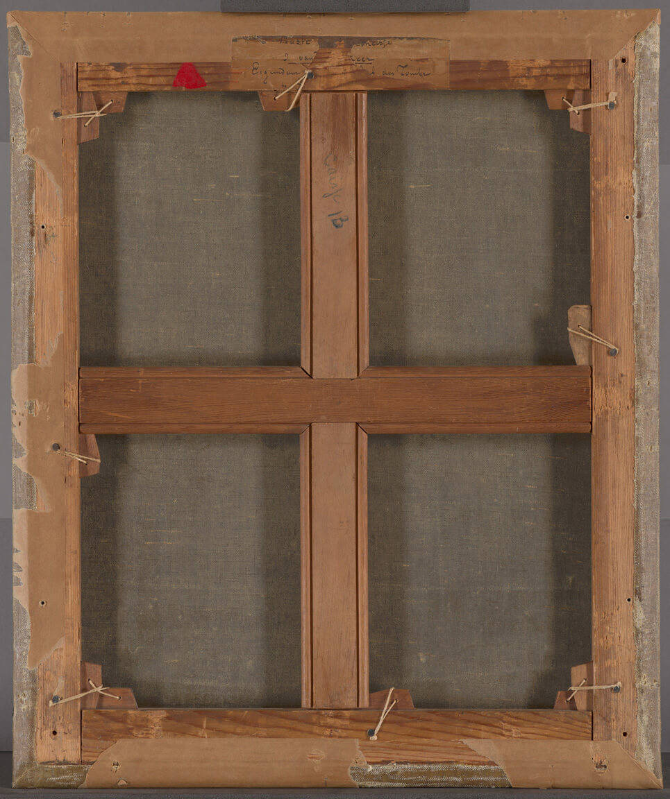 Na het aanbrengen van de grondering werd het doek van het rijgraam gehaald en overgespannen op een spanraam: een rechthoek van vier houten latjes. We weten niet of Vermeer het doek eigenhandig op het raam heeft bevestigd. Weinig zeventiende-eeuwse doeken zitten na 450 jaar nog op hun originele spanraam. Eén schilderij van Vermeer – De gitaarspeelster – vormt hierop een uitzondering. De uiterste randen van het doek (de spijkerranden) werden om de zijkanten van het spanraam geslagen en ‘vastgespijkerd’ met houten pennen.