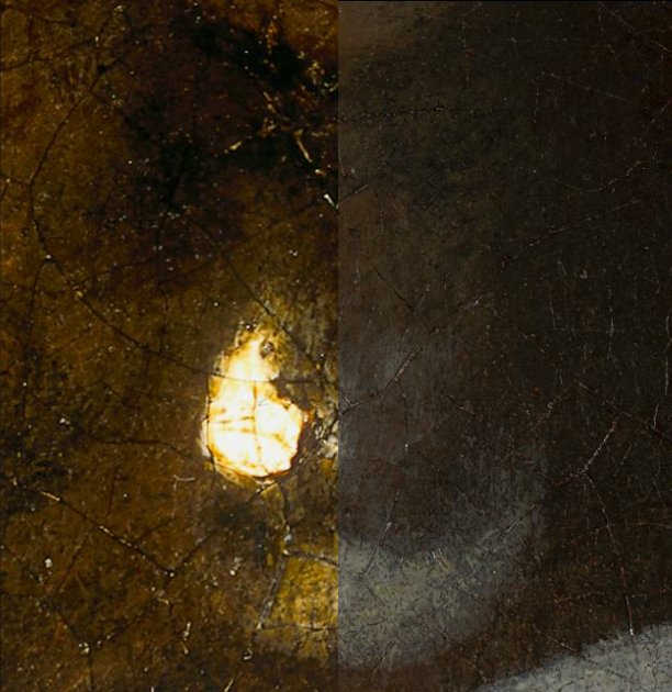 Het meestbesproken losgeraakte stukje is wel het ‘tweede hoogsel’ op de parel in het oor van het Meisje. Tot aan de behandeling in 1994 dacht men dat de parel twee helderwitte lichtaccenten bevatte: een traanvormige bovenaan en een kleintje wat meer naar beneden. Maar... het kleinste van de twee bleek helemaal geen lichtaccent te zijn.