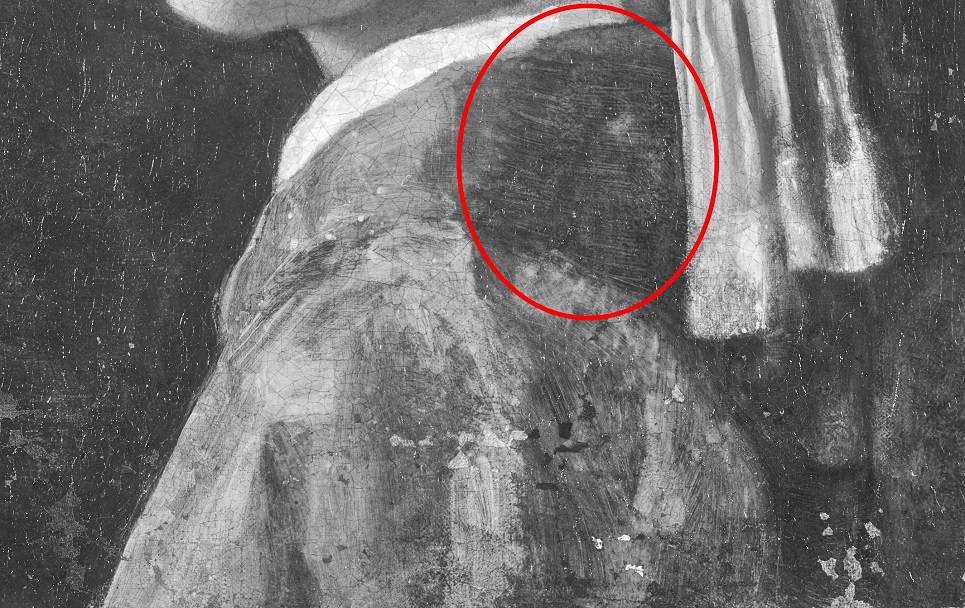 Wanneer de bruine doodverf droog was, schilderde Vermeer er met een enkele laag verf overheen (laag 3). In sommige partijen van het jasje – zoals de cartridge plooitjes aan de achterkant van haar schouder – is de onderlaag nog door de verf heen te zien. De onderlaag van haar rug bevat houtskoolzwart, die met infrarood kan worden opgespoord. Op de infraroodopname van haar schouder zien we dat Vermeer deze met een brede kwast aanbracht.
