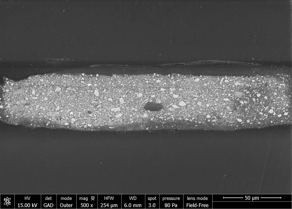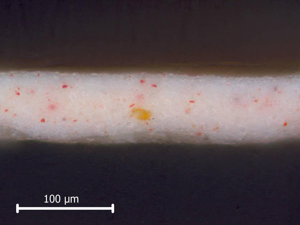 Dit is een dwarsdoorsnede uit de achtergrond van het Meisje, waar Vermeer houtskoolzwart gebruikte onder een transparante glacislaag. De splinterige zwarte deeltjes zijn verkoolde houtvezels.