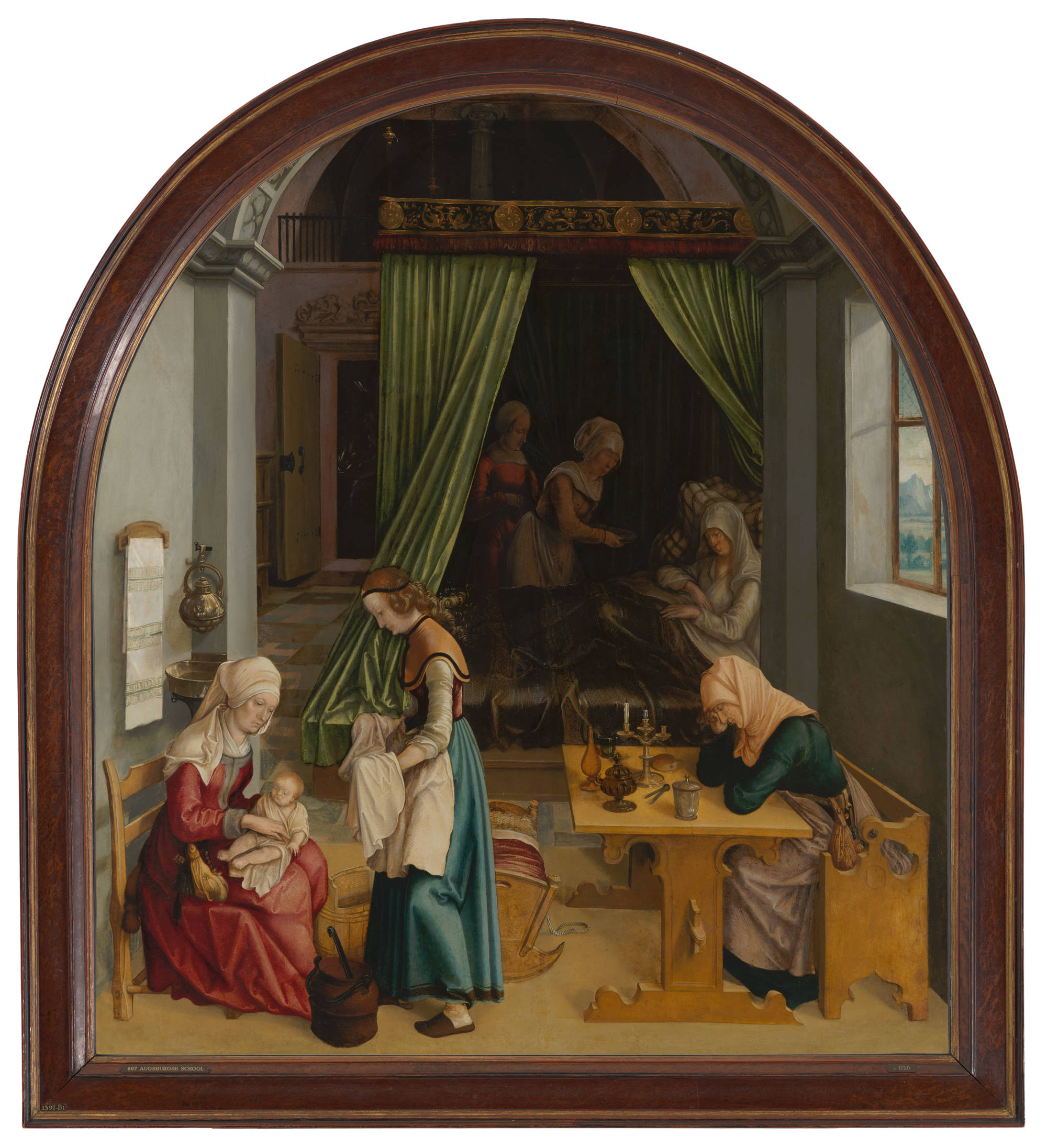 Anne lies in a big four-poster bed with green curtains. She has just given birth to her daughter Mary, who will later become the mother of Jesus. While Anne recovers, two maternity nurses occupy themselves with the child. A midwife is taking a rest from her work at the table.
