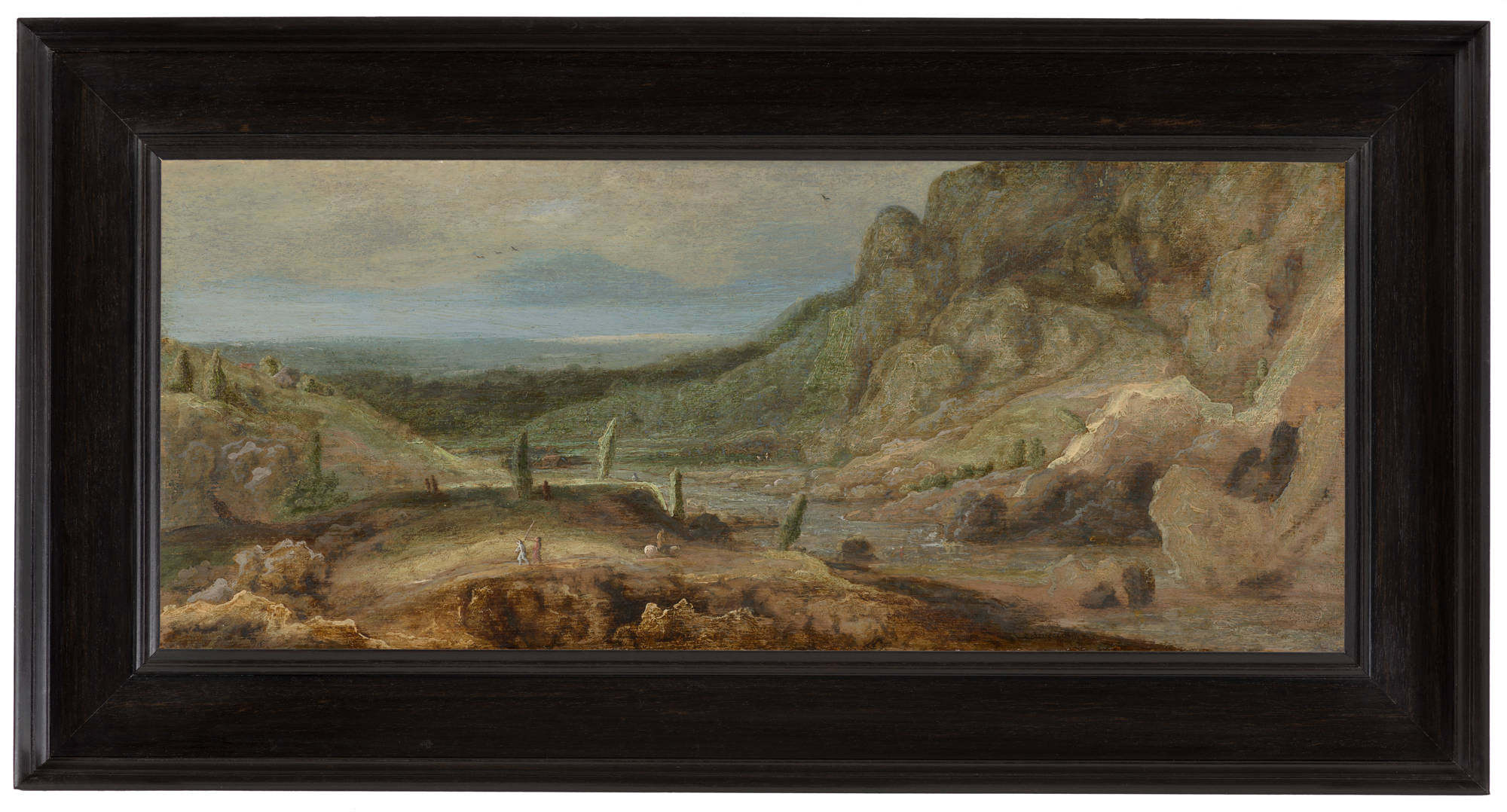 A landscape with a tumbling river and rugged boulders. Seghers painted this imaginary landscape with fanciful brushstrokes, creating a grand and mysterious landscape on this small panel. The effect is reinforced by the passers-by, who appear very small and insignificant in the overwhelming presence of nature.