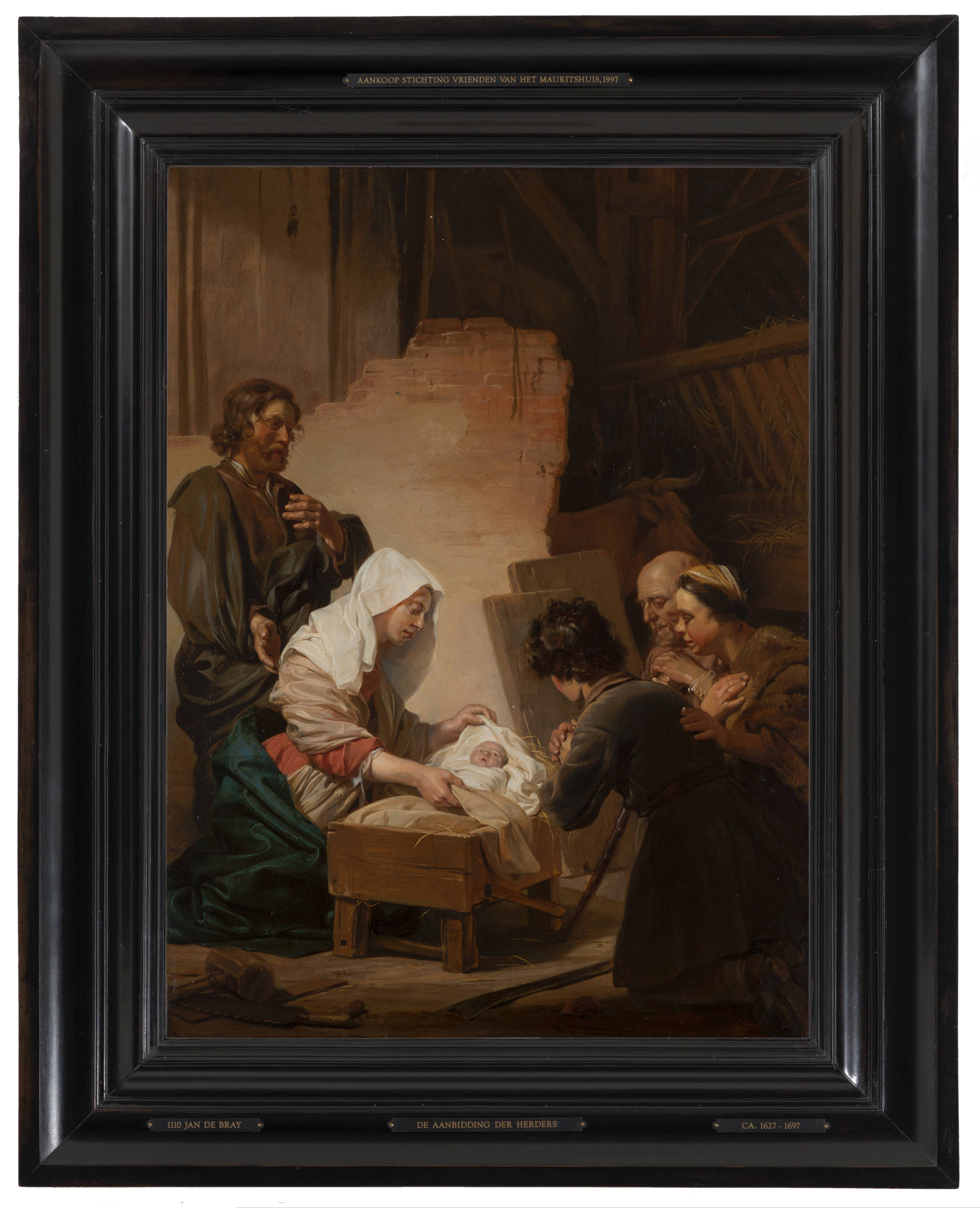 In the stable in Bethlehem, three shepherds kneel worshipping the newborn baby Jesus. Mary is lifting the covers to show them the Child. The warm light and subdued colours lend an intimate atmosphere to the painting, which is reflected in the loving gestures of the figures.