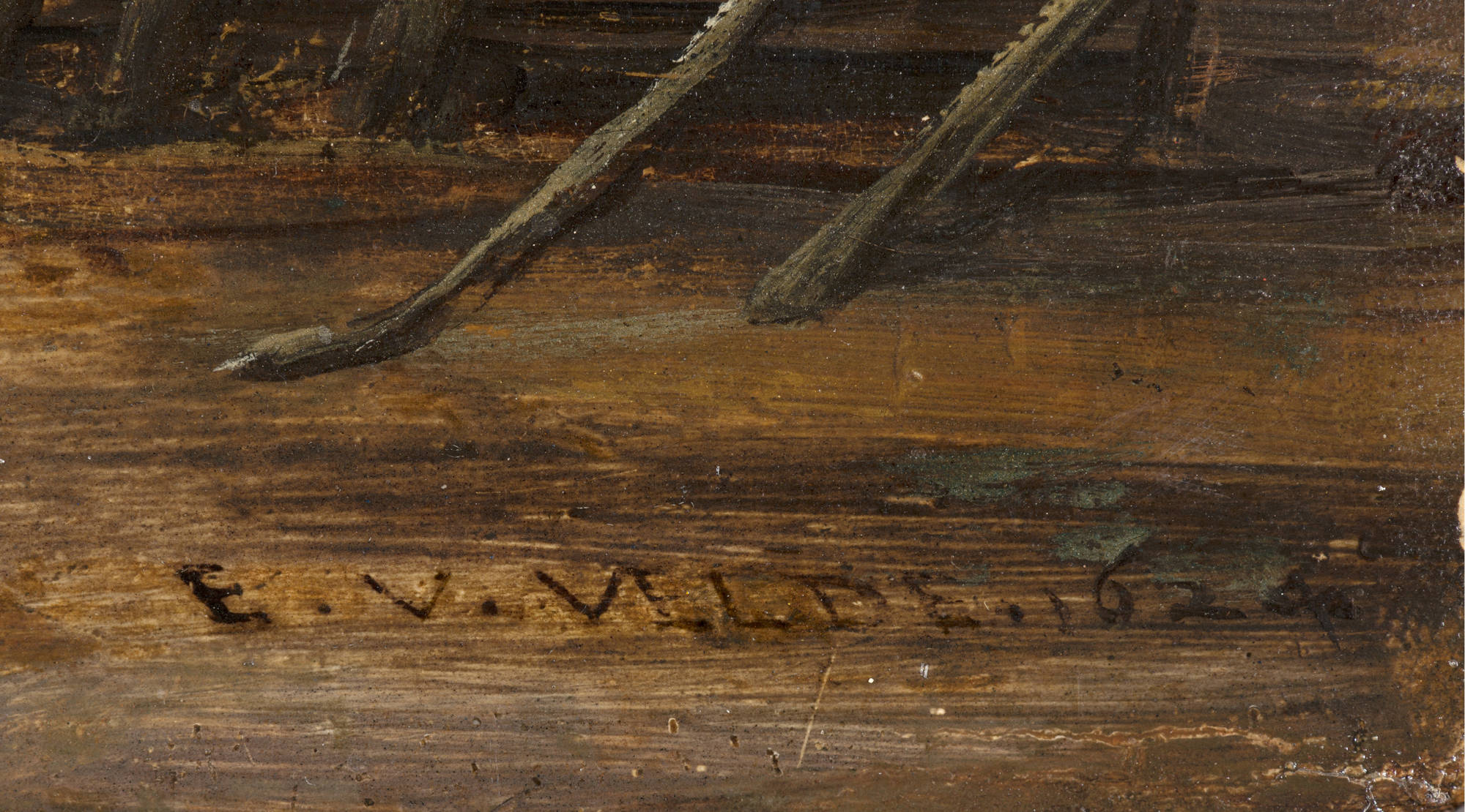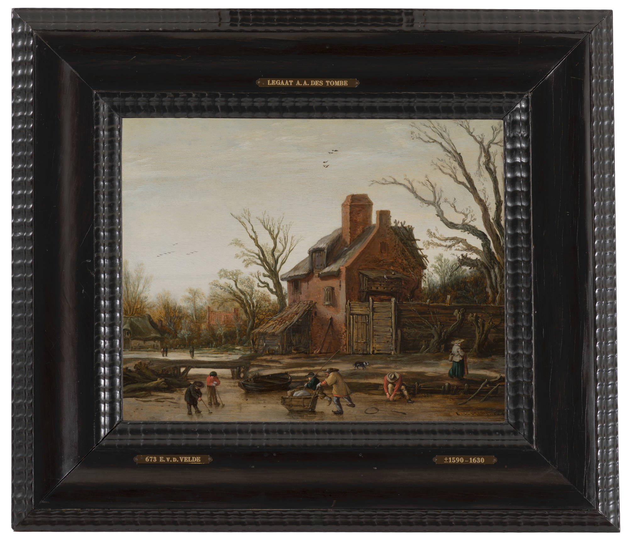 Esaias van de Velde painted a simple winter landscape: a house on the banks of a frozen canal with a few people on the ice. One man is tying on his skates and another is pushing along a sledge, while two boys are playing ‘kolf’ – a game similar to today’s ice hockey. Van de Velde chose a low vantage point and did not paint a panorama. So it seems as if we are standing on the banks of the canal ourselves.